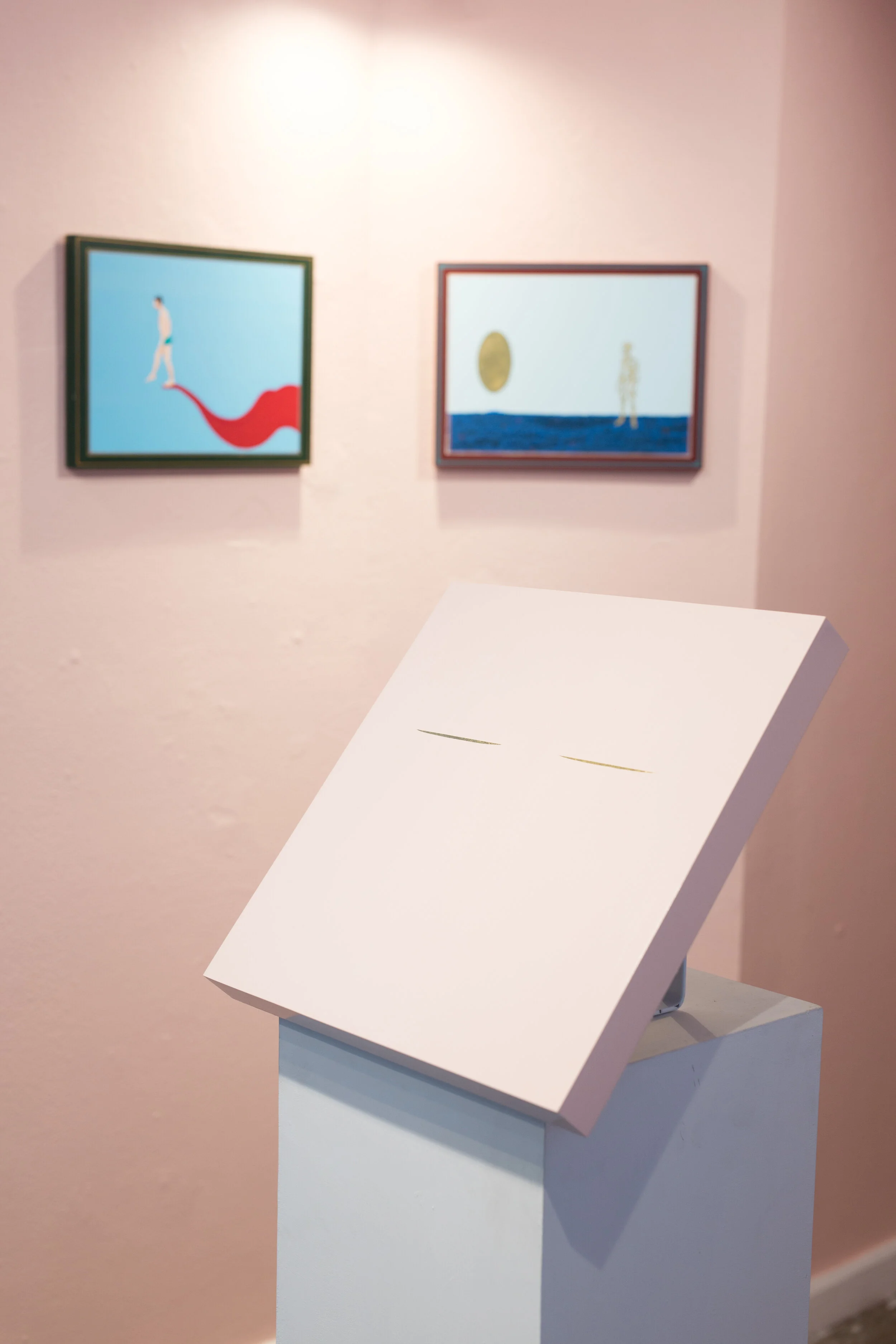 Metaphorically speaking, it is said that the eyes are the windows of the soul. I understand this to mean that they exist as a portal between the space that surrounds us and our rich inwardness. "Eye contact" is the title of the central painting of this exhibition, and it is a link that unites the artworks presented in their mutual search. Together, these paintings explore the nature of human communication as both a verbal and physical language influenced by the unconscious psyche.